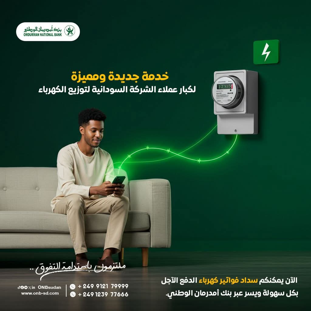 متابعات – النورس نيوز –الآن يمكنكم سداد فواتير كهرباء الدفع الآجل بكل سهولة وأمان عبر بنك أمدرمان الوطني من خلال قنواتنا الرقمية.