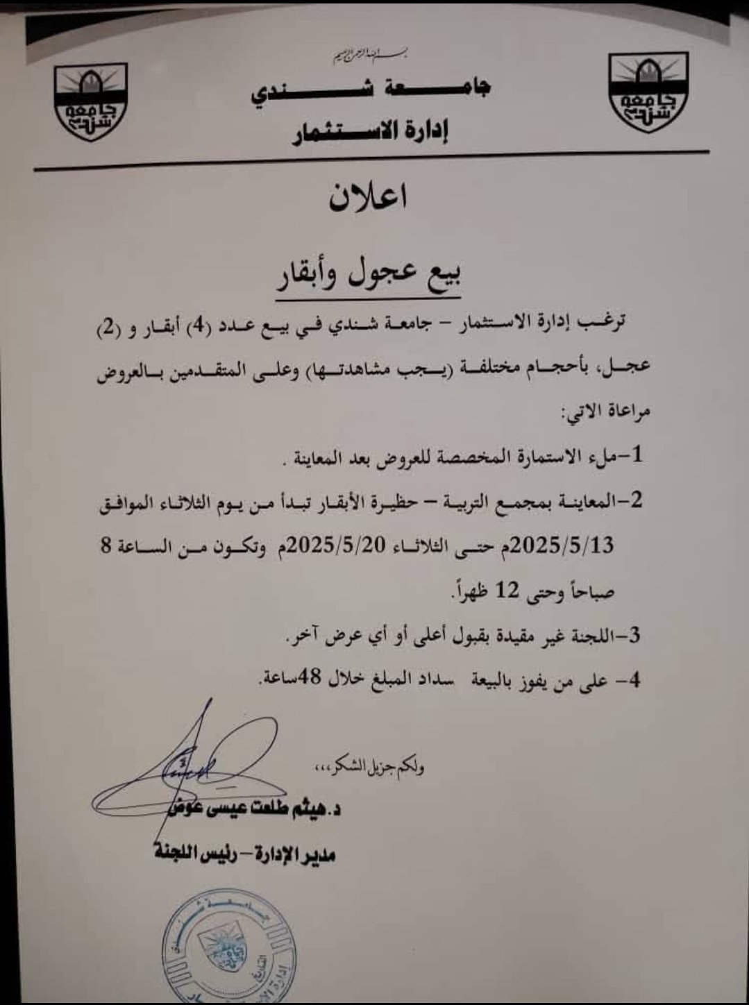 ووفقًا لإعلان رسمي، تعتزم الإدارة بيع 4 أبقار و2 عجل بأحجام مختلفة، مشيرة إلى ضرورة معاينة الحيوانات قبل تقديم العروض. وخصصت إدارة الجامعة حظيرة الأبقار بمجمع كلية التربية كموقع للمعاينة، التي تبدأ اعتبارًا من الثلاثاء 13 مايو وحتى الثلاثاء 20 مايو 2025، من الساعة 8 صباحًا حتى 12 ظهرًا.