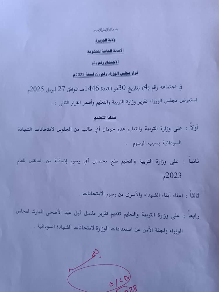 في اجتماع مجلس وزراء حكومة ولاية الجزيرة بتاريخ 27 أبريل 2025، ألزم المجلس وزارة التربية والتعليم بتقديم تقرير مفصل حول ترتيبات امتحانات الشهادة السودانية للعام 2023، شاملاً أوضاع الطلاب العالقين، وذلك قبل حلول عيد الأضحى المبارك.