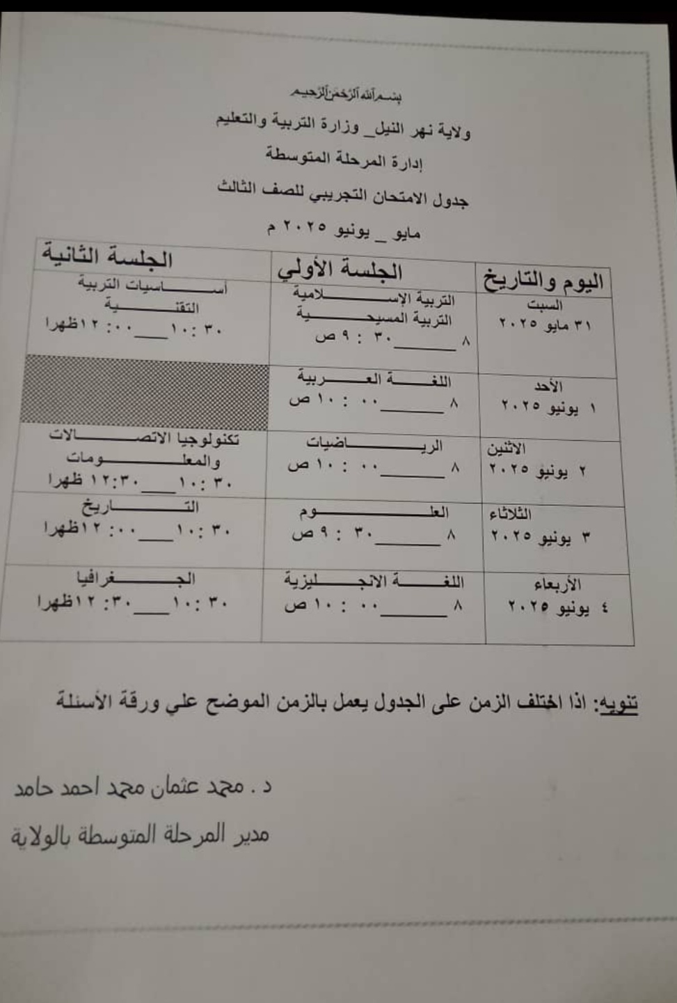 أكملت وزارة التربية والتعليم بولاية نهر النيل، ممثلة في إدارة المرحلة المتوسطة كافة ترتيباتها لبداية الامتحانات التجريبية للصف الثالث متوسط على مستوى الولاية.