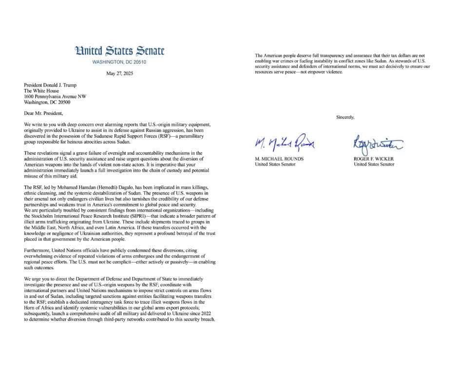 متابعات- النورس نيوز- دعا أعضاء مجلس الشيوخ الأمريكيون من الحزب الجمهوري مايكل روندز وروجر ويكر، دونالد ترامب إلى تكليف وزارة الدفاع ووزارة الخارجية بالتحقيق الفوري في وجود واستخدام قوات الدعم السريع السودانية لأسلحة أمريكية الصنع.