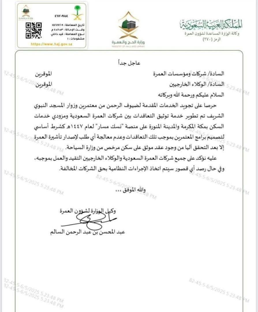أصدرت وزارة الحج والعمرة في المملكة العربية السعودية تعميماً عاجلاً موجهاً إلى شركات ومؤسسات العمرة، إضافة إلى الوكلاء الخارجيين، يشدد على ضرورة الالتزام التام بتوثيق عقود السكن الخاصة بضيوف الرحمن من المعتمرين، وذلك قبل البدء بأي إجراءات تتعلق بطلب إصدار تأشيرات العمرة.