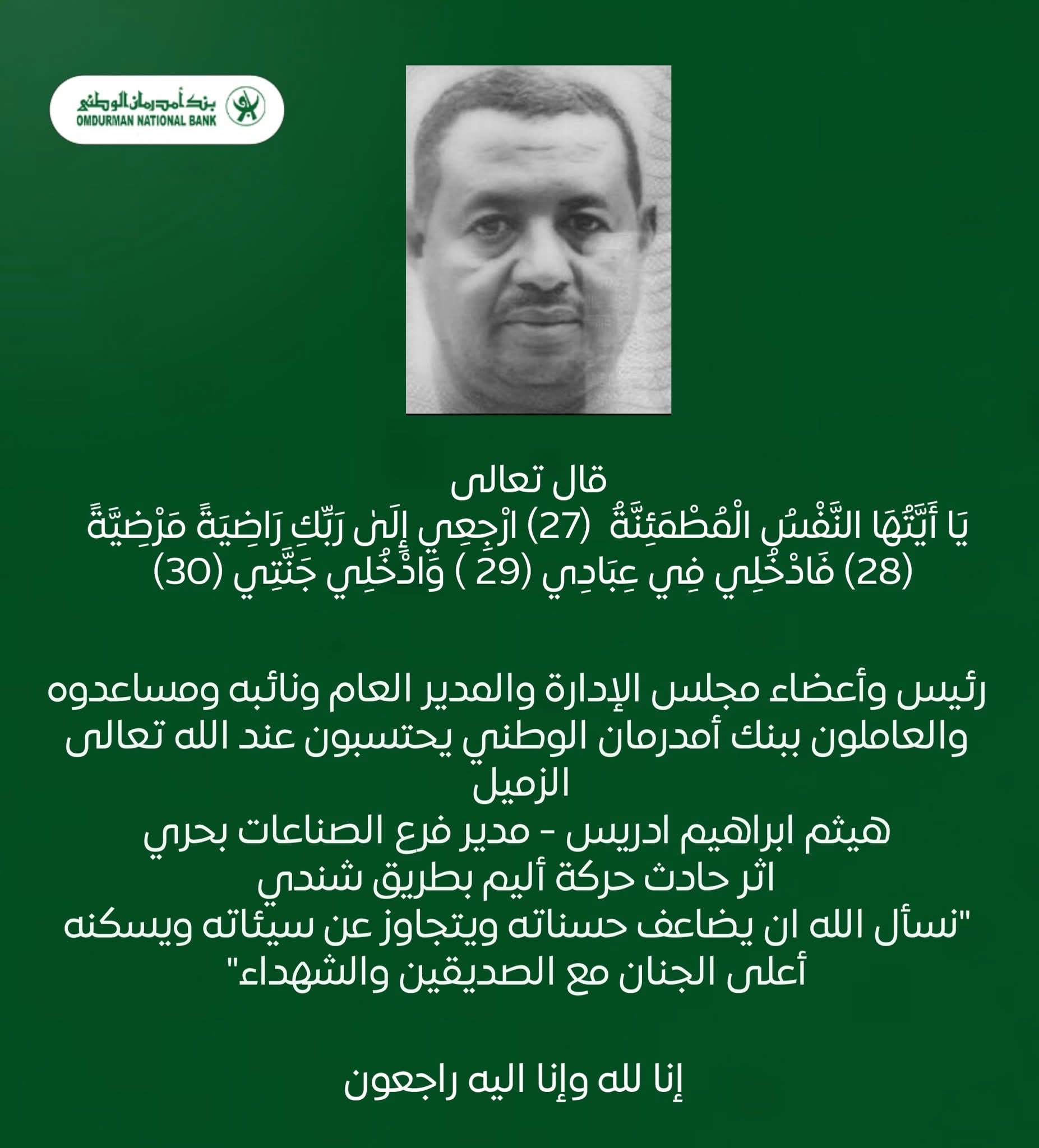 بقلوب مؤمنة بقضاء الله وقدره، ينعى رئيس وأعضاء مجلس الإدارة، والمدير العام، ونائبه، ومساعدوه، وجميع منسوبي بنك أمدرمان الوطني، الزميل العزيز هيثم إبراهيم إدريس، مدير فرع الصناعات بحري، الذي انتقل إلى جوار ربه إثر حادث حركة أليم بطريق شندي.