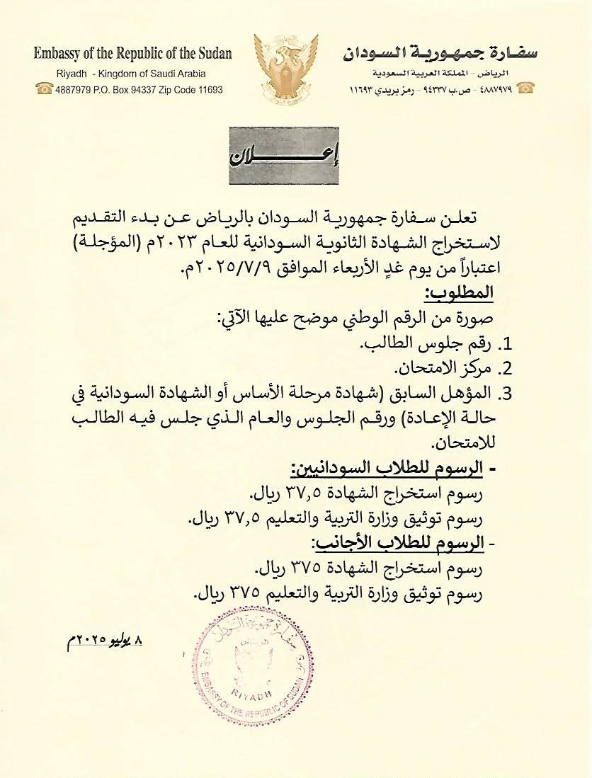 الرياض –النورس نيوز _ 8 يوليو 2025 – أعلنت سفارة جمهورية السودان بالعاصمة السعودية الرياض عن بدء إجراءات التقديم لاستخراج الشهادة الثانوية السودانية للعام الدراسي 2023م (المؤجلة)، وذلك اعتباراً من يوم الأربعاء الموافق 9 يوليو 2025.