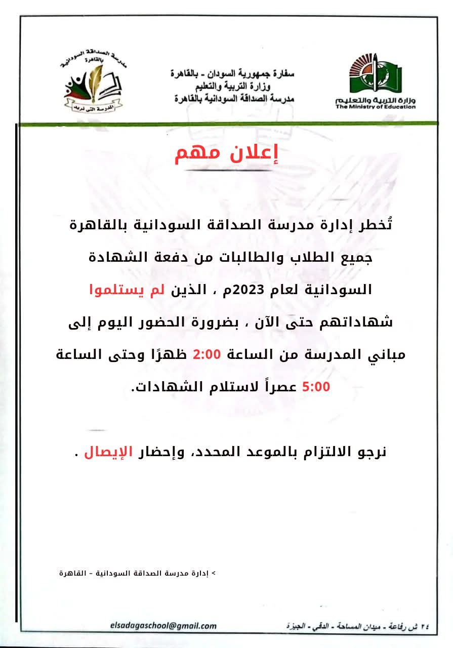 متابعات – النورس نيوز – تُخطر إدارة مدرسة الصداقة السودانية بالقاهرة جميع الطلاب والطالبات من دفعة الشهادة السودانية لعام 2023م ،