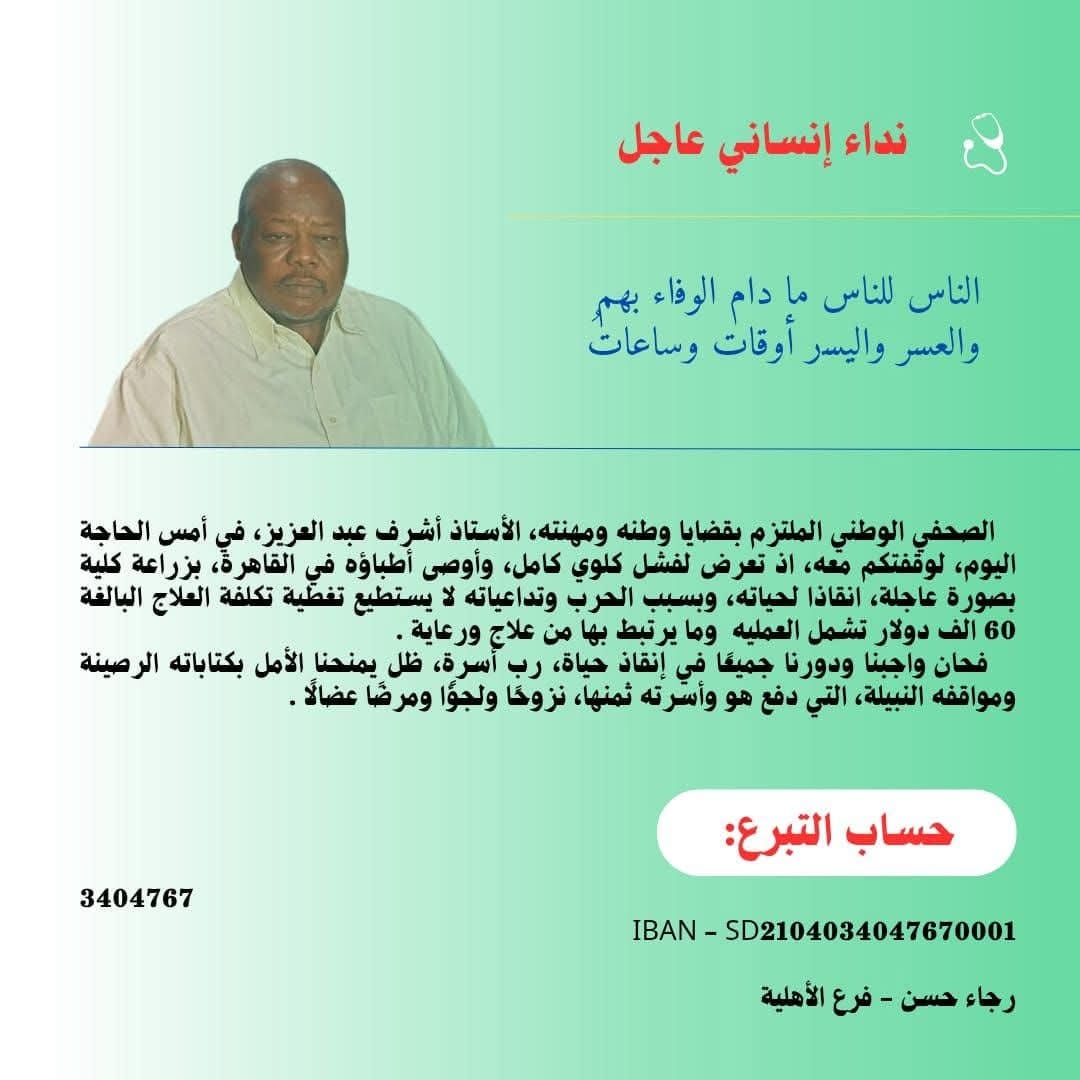 ووجه الصحفيون نداءً عاجلًا قالوا فيه إن أشرف الصحفي الوطني الملتزم بقضايا وطنه ومهنته، والذي تعرض لفشل كلوي كامل، وأوصى أطباؤه في القاهرة، بزراعة كلية بصورة عاجلة، انقاذا لحياته، وبسبب الحرب وتداعياته لا يستطيع تغطية تكلفة العلاج البالغة 60 الف دولار تشمل العملية وما يرتبط بها من علاج ورعاية، فحان واجبنا ودورنا جميعًا في إنقاذ حياة، رب أسرة، ظل يمنحنا الأمل بكتاباته الرصينة ومواقفه النبيلة، التي دفع هو وأسرته ثمنها، نزوحا ولجوا ومرضا عضالا.