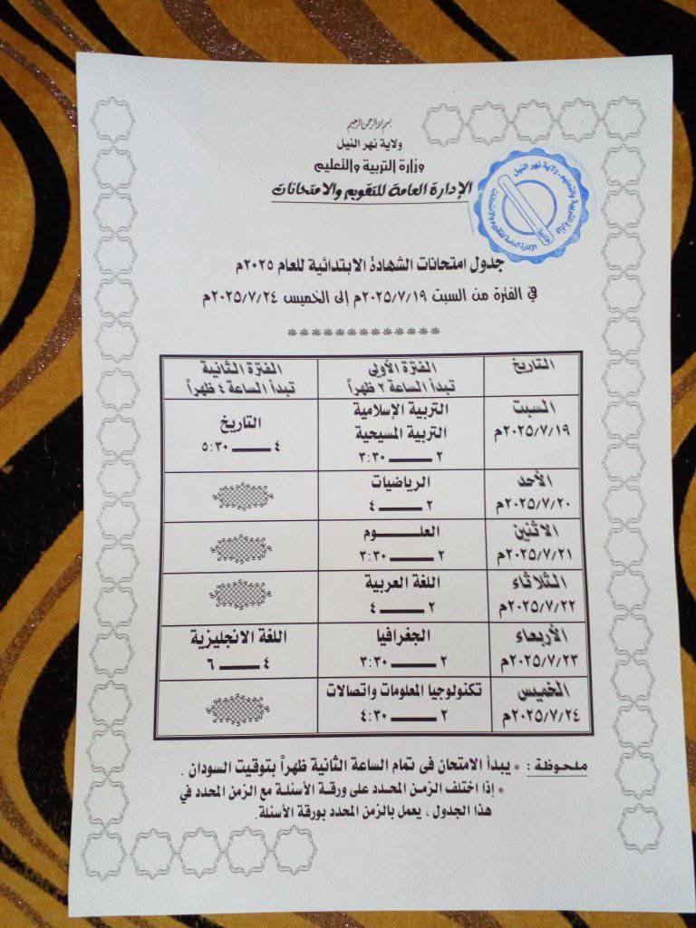 متابعات – النورس نيوز- قررت وزارة التربية والتعليم بولاية نهر النيل تعديل موعد الجلوس لامتحانات الشّهادتين الابتدائيّة والمتوسّطة والمراكز الخارجيّة من ضمنها “مراكز القاهرة” للعام2025 لتبدأ الجلسات في السّاعة الثّانية ظهراً بتوقيت السّودان بدلاً عن الثّامنة صباحاً وذلك وفقاً للخطاب الوارد من وزارة الخارجيّة عبر وزارة التّربية والتّعليم الاتحاديّة بهذا الخصوص نسبةً لوجود أنشطة تعليميّة بالمدارس المصريّة في الفترة الصّباحيّة.