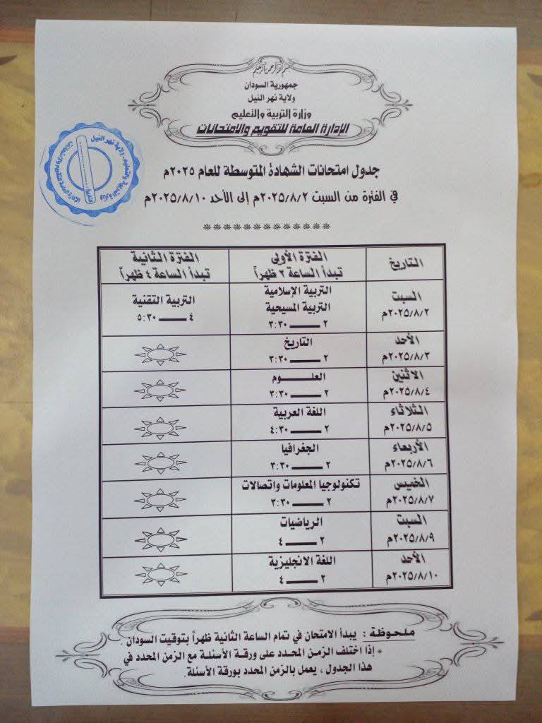 وتبدأ إمتحانات الشهادة المتوسطة في يوم 2 أغسطس من الشهر المقبل، بينما تبدأ إمتحانات الشهادة الإبتدائية السبت 17 يوليو الجاري، وتنشر منصة السودان جدول امتحانات الشهادة الإبتدائية و المتوسطة كما وردنا من وزارة التربية و التعليم ولاية نهر النيل