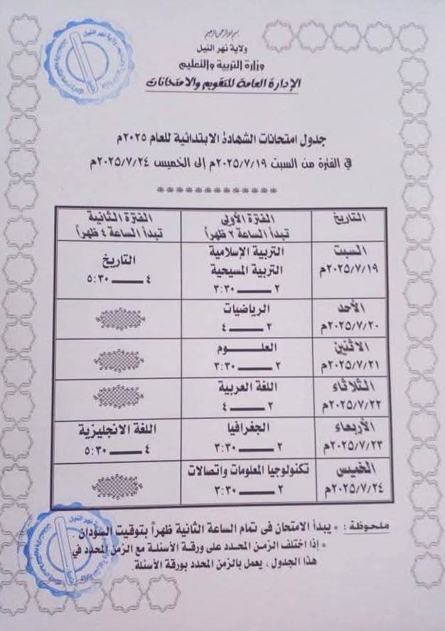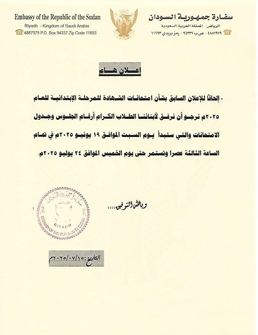 كشفت سفارة جمهورية السودان بالمملكة العربية السعودية – الرياض، عن تفاصيل جديدة تتعلق بامتحانات الشهادة الابتدائية للعام 2025، مؤكدة بدء الجلسات الامتحانية يوم السبت 19 يوليو وتستمر حتى الخميس 24 يوليو 2025، وذلك وفق الجدول المُعد مسبقًا من الجهات المختصة.