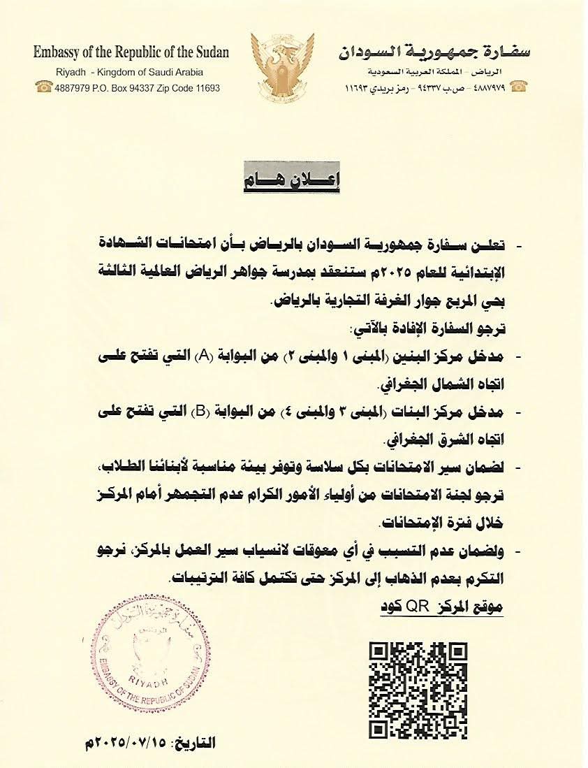 إعلان مهم من سفارة السودان بالرياض