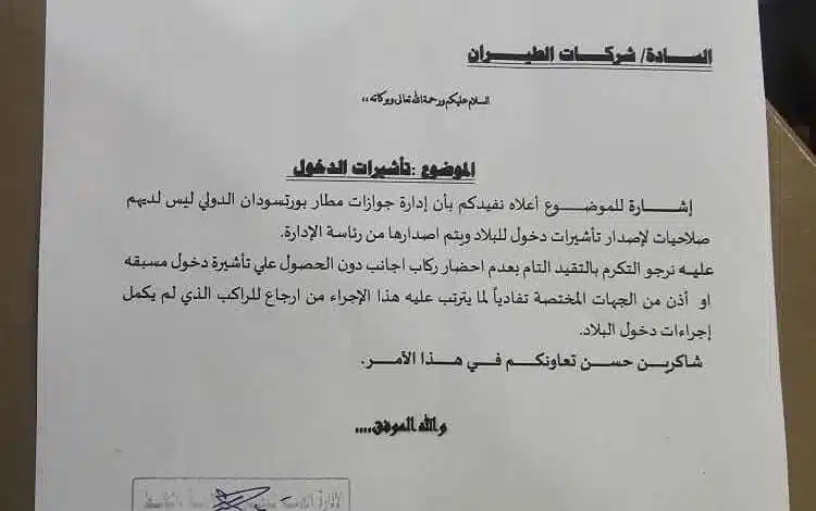 ووجهت شركة مطارات السودان في تعميم لكل شركات الطيران بعدم نقل أي أجنبي دون تأشيرة مسبقة أو إذن من الجهات المختصة.