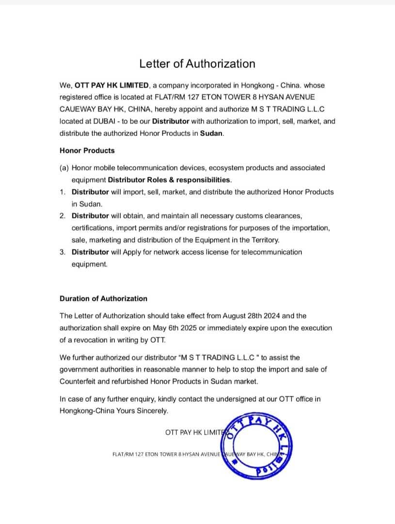 1. “Honor International FZCO” (دبي) منحت حق التوزيع لشركة “Telling Telecom (HK)” من 7 مايو 2024 إلى 6 مايو 2025.