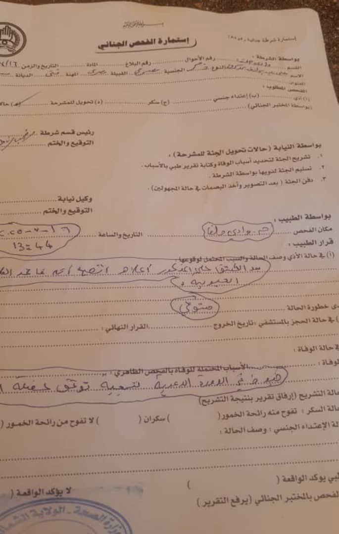 وفور تلقي البلاغ حضرت الشرطة والأدلة الجنائية إلى مكان الوفاة واستكملت كافة الإجراءات القانونية من تصوير ورسم جثمان وعقب الإجراءات تم تحريك الجثمان إلى مستشفى وادي حلفا بموجب الأورنيك الجنائي أرونيك 8 لإجراء الكشف الطبي .