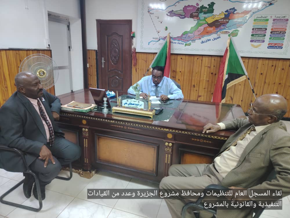 جاء ذلك خلال لقاء جمعه بمحافظ مشروع الجزيرة المهندس إبراهيم مصطفى علي بمكتبه في بركات، بحضور عدد من القيادات التنفيذية والقانونية بالمشروع، من بينهم مدير الإدارة القانونية الدكتور الصادق مفرح، والمستشار القانوني مولانا بدوي بابكر الفضل، ومدير مصلحة شؤون المزارعين المهندس عبدالمطلب محجوب، ومسؤول ملف الري المهندس عثمان جاسر، ورئيس المراجعة الداخلية الأستاذ حافظ حكيم، والمدير التنفيذي لمكتب المحافظ المهندس خالد الطاهر.
