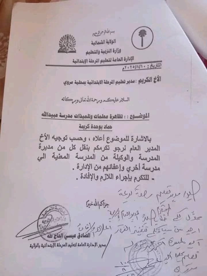 أصدرت إدارة التعليم بالولاية الشمالية قراراً بنقل مدير مدرسة عبيدالله الأساسية ووكيلها إلى مدارس أخرى، وحرمان المدير من تقلد أي منصب إداري مستقبلاً، وذلك على خلفية مظاهرة سلمية نظمها تلاميذ المدرسة للمطالبة بعودة التيار الكهربائي الذي انقطع عن المدينة لمدة 12 يوماً.