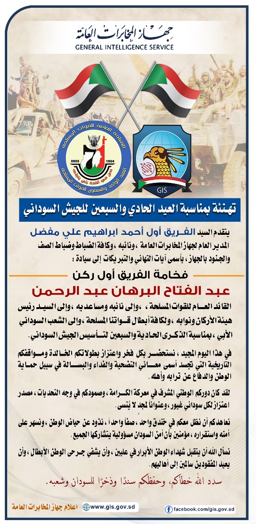 واختتمت التهنئة بالدعاء لشهداء الوطن بالرحمة والمغفرة، وللجرحى بالشفاء العاجل، وللمفقودين بالعودة سالمين، سائلًا الله أن يحفظ القوات المسلحة سندًا وذخرًا للسودان وشعبه.