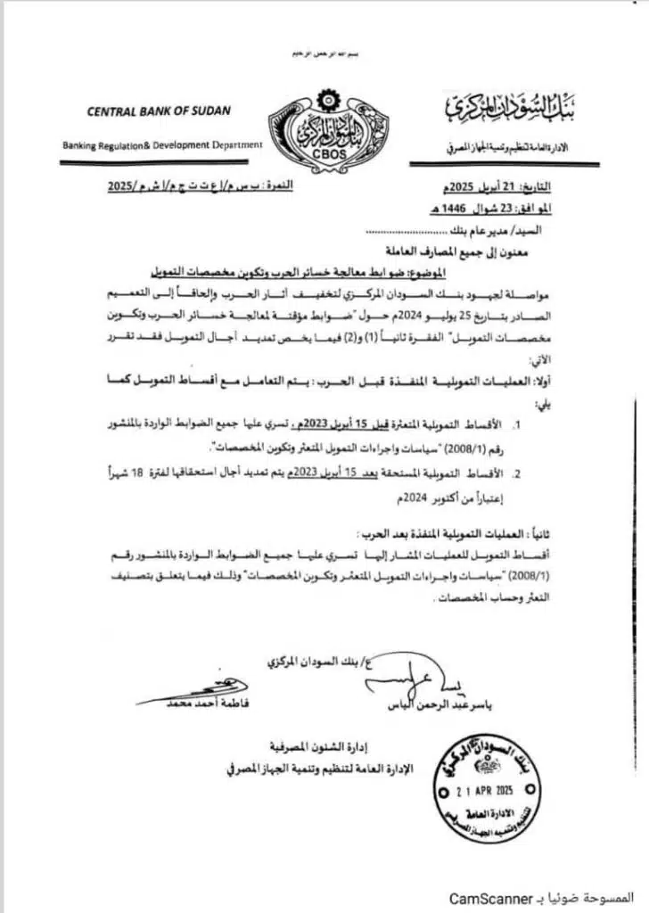ويأتي ذلك في الوقت الذي أصدر فيه بنك السودان المركزي ضوابط جديدة لمعالجة خسائر الحرب وتكوين مخصصات التمويل، مؤكداً على تمديد آجال استحقاق الأقساط التمويلية للعمليات المنفذة بعد 15 أبريل 2023 لمدة 18 شهراً اعتباراً من أكتوبر 2024، وتطبيق ضوابط المنشور رقم (2008/1) على التمويلات المتعثرة.
