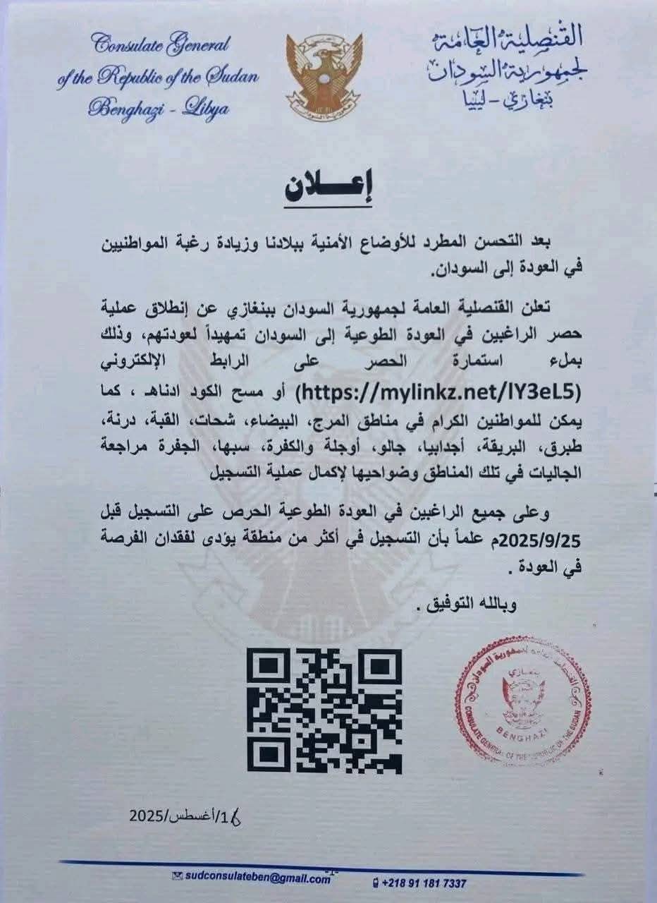 وذلك عبر الرابط الإلكتروني المخصص أو من خلال مراجعة الجاليات السودانية في مناطق: المرج، البيضاء، شحات، القبة، درنة، طبرق، البريقة، إجدابيا، الواحات، الكفرة، سبها، الجفرة.