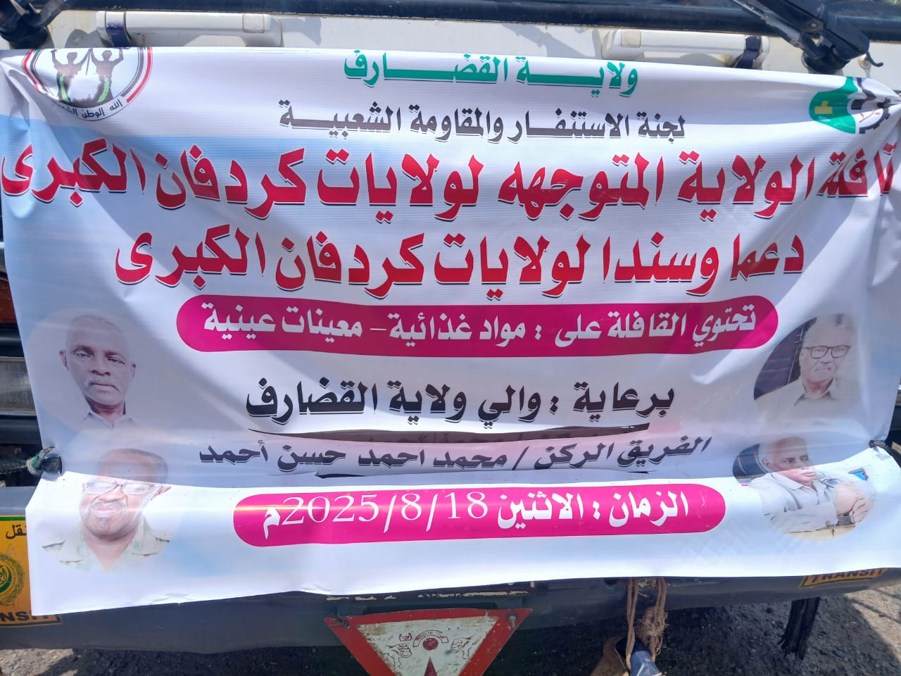 القضارف- 18 أغسطس 2025 – النورس نيوز – سيرت لجنة الاستنفار والمقاومة الشعبية بولاية القضارف قافلة دعم متجهة إلى ولايات كردفان الكبرى، في إطار مساندة القوات المسلحة بمعركة الكرامة، حيث احتوت القافلة على مواد غذائية ومعينات عينية، وذلك من أمام أمانة الحكومة.