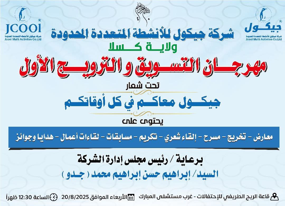كسلا – 19 أغسطس 2025 – النورس نيوز – تستعد ولاية كسلا لاستقبال المهرجان الأول للتسويق والترويج الذي تنظمه شركة جيكول للأنشطة المتعددة المحدودة، والمقرر إقامته يوم الأربعاء الموافق 20 أغسطس 2025م بقاعة الريح الطريفي للاحتفالات غرب مستشفى المبارك، عند الساعة 12:30 ظهراً.