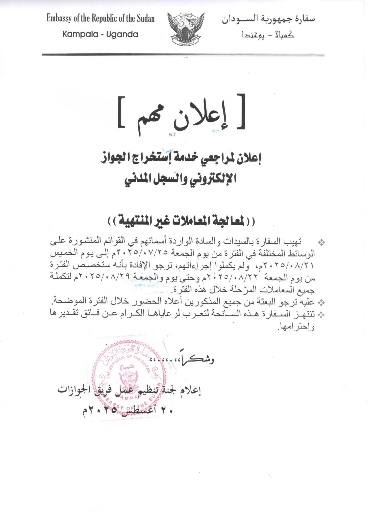وأعربت سفارة السودان بكمبالا عن شكرها وتقديرها لأبناء الجالية السودانية على صبرهم وتعاونهم، مؤكدة حرصها على تقديم أفضل الخدمات القنصلية وتسهيل إجراءات استخراج الجوازات والمعاملات المدنية.