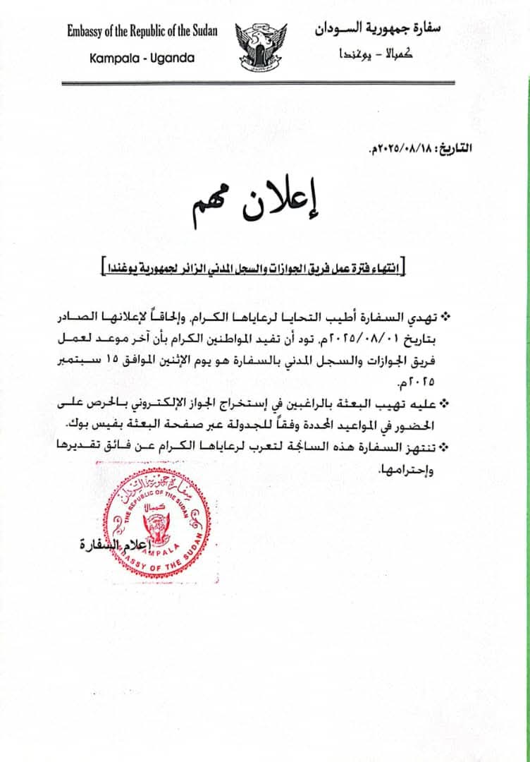 أعلنت سفارة جمهورية السودان في العاصمة الأوغندية كمبالا، عن قرب انتهاء فترة عمل فريق الجوازات والسجل المدني الزائر، مؤكدة أن الاثنين 15 سبتمبر 2025 سيكون آخر يوم لتقديم الخدمات القنصلية المتعلقة باستخراج الجواز الإلكتروني ومعاملات السجل المدني.