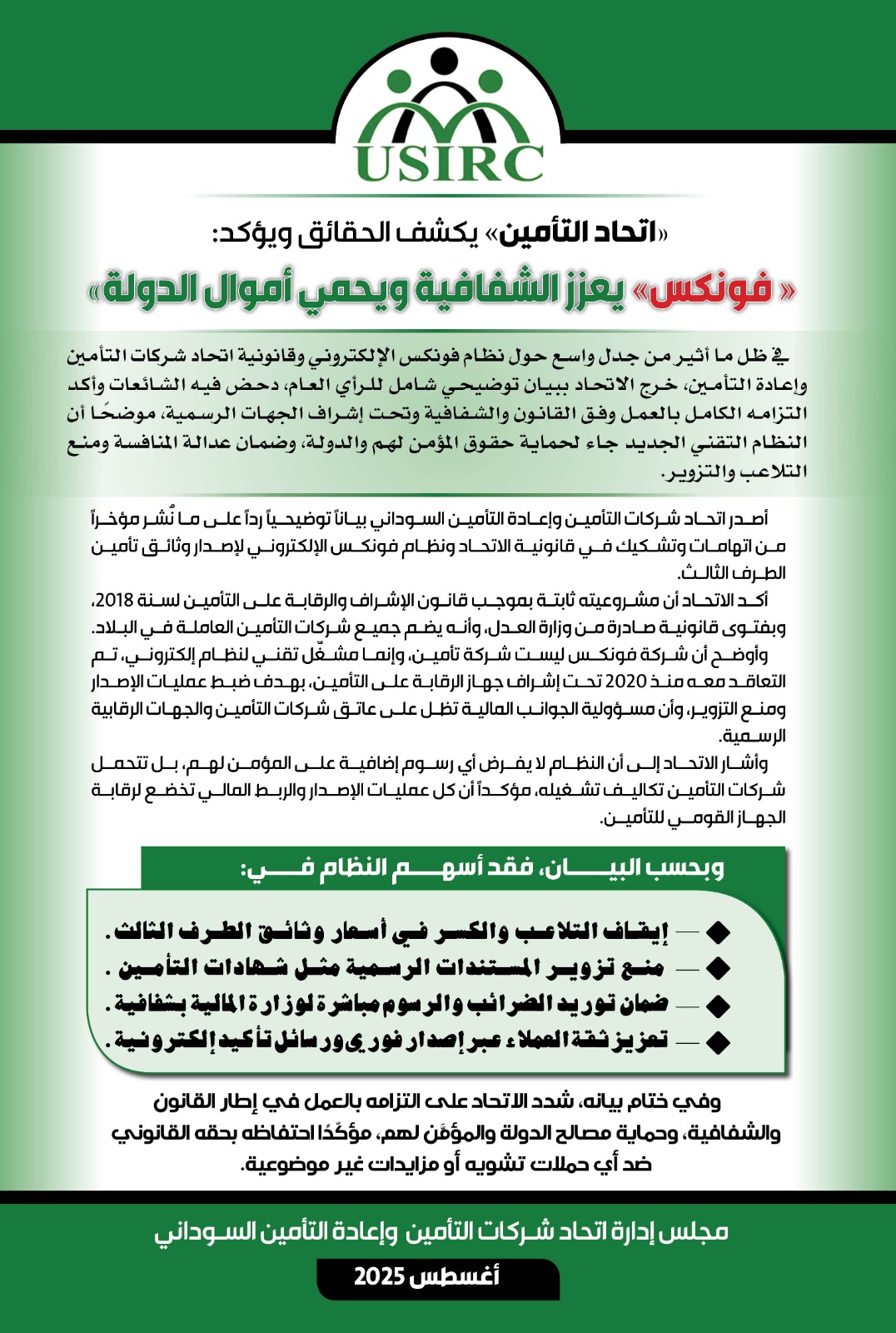 الخرطوم، أغسطس 2025 – النورس نيوز _ أصدر اتحاد شركات التأمين وإعادة التأمين السوداني بيانًا رسميًا لتوضيح الحقائق بشأن نظام فونكس الإلكتروني، بعد الجدل الأخير حول قانونية الاتحاد وشرعية عمل النظام.