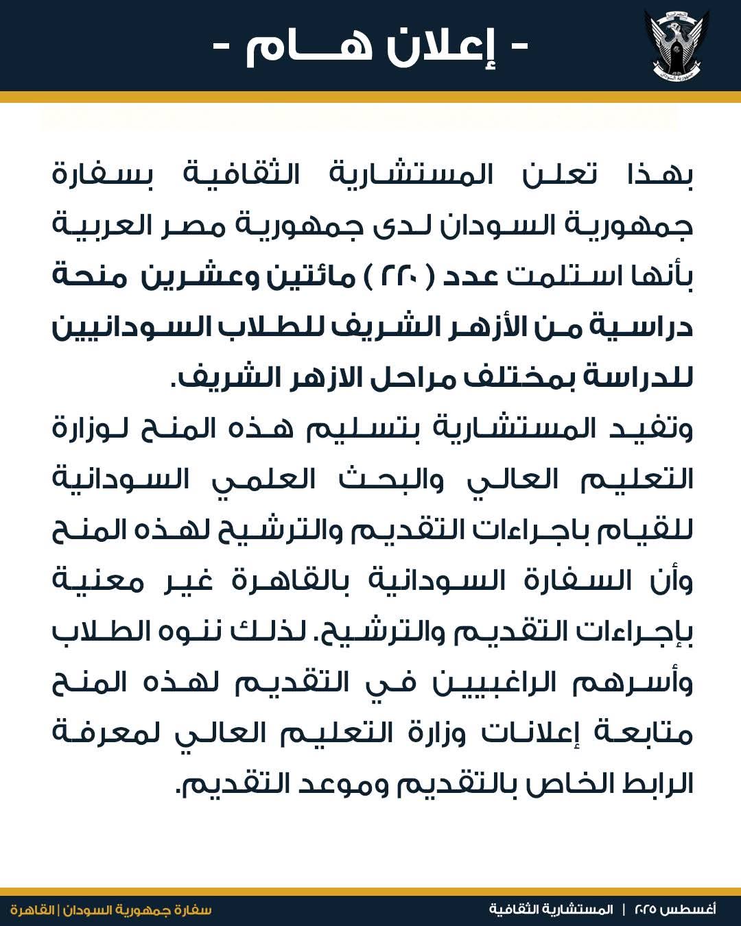 النورس نيوز _ تعلن المستشارية الثقافية بسفارة جمهورية السودان لدى جمهورية مصر العربية عن استلامها عدد 220 منحة دراسية من الأزهر الشريف للطلاب السودانيين للدراسة بمختلف مراحل الأزهر الشريف.