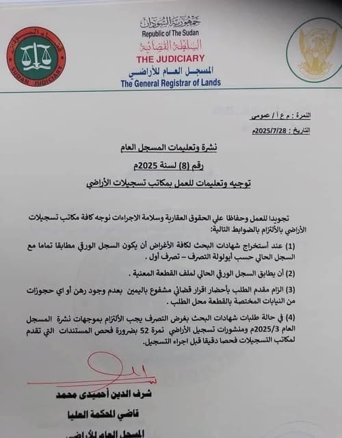 الخرطوم – النورس نيوز – أصدر المسجل العام للأراضي، قاضي المحكمة العليا شرف الدين أحميدي محمد، توجيهات جديدة لمكاتب تسجيل الأراضي تهدف إلى تحسين جودة العمل وحماية الحقوق العقارية وسلامة الإجراءات.