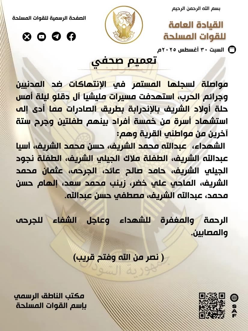 الخرطوم – 30 أغسطس 2025 – النورس نيوز – استهدفت مسيرات مليشيا آل دقلو مساء أمس حلة أولاد الشريف في الأندرابة على طريق الصادرات، في حادثة جديدة ضمن سلسلة الانتهاكات ضد المدنيين وجرائم الحرب التي تشهدها المنطقة. وأسفرت الهجمات عن استشهاد أسرة كاملة مكونة من خمسة أفراد، بينهم طفلتان، وإصابة ستة آخرين من أبناء القرية.