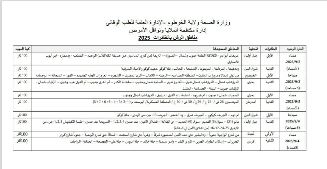 أعلنت وزارة الصحة بولاية الخرطوم، الإدارة العامة للطب الوقائي، وإدارة مكافحة الملاريا ونواقل الأمراض عن جدول مناطق الرش الطارئ للعام 2025، وذلك ضمن جهودها المكثفة لمكافحة الملاريا والأمراض المنقولة بالنواقل.