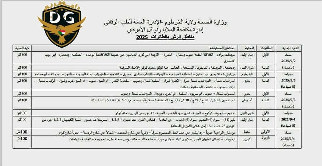 متابعات – النورس نيوز – أعلنت وزارة الصحة بولاية الخرطوم عبر الإدارة العامة للطب الوقائي وإدارة مكافحة الملاريا ونواقل الأمراض، عن بدء حملة رش جوي بالطائرات تستمر من الثلاثاء 2 سبتمبر حتى الخميس 4 سبتمبر 2025، تستهدف الأحياء والمربعات ذات الكثافة السكانية العالية.