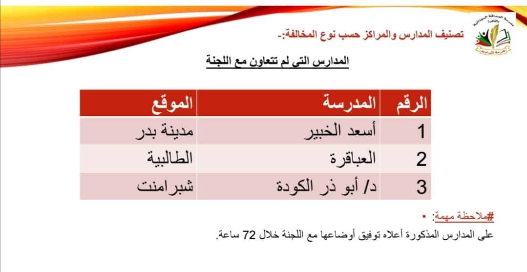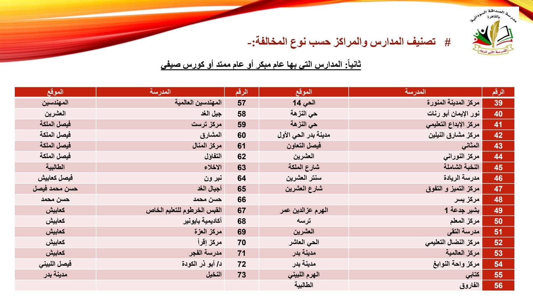 2️⃣ مدارس ومراكز مخالفة مع فرصة تصحيح الوضع: تم توجيه إنذار نهائي لها بالاغلاق، ومنعها من مزاولة أي نشاط تعليمي سوداني إذا لم تلتزم بتوفيق أوضاعها خلال ٧٢ ساعة، وتشمل المدارس التي بدأت التسجيل للعام الدراسي 2025 – 2026م أو لم تتعاون مع اللجنة.