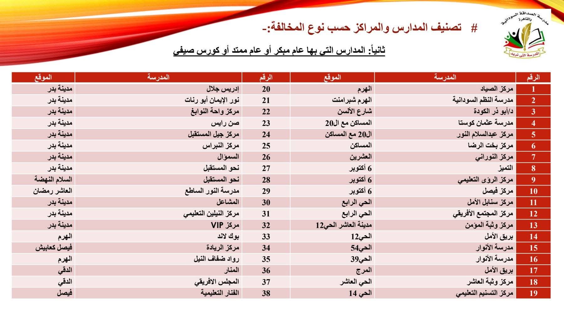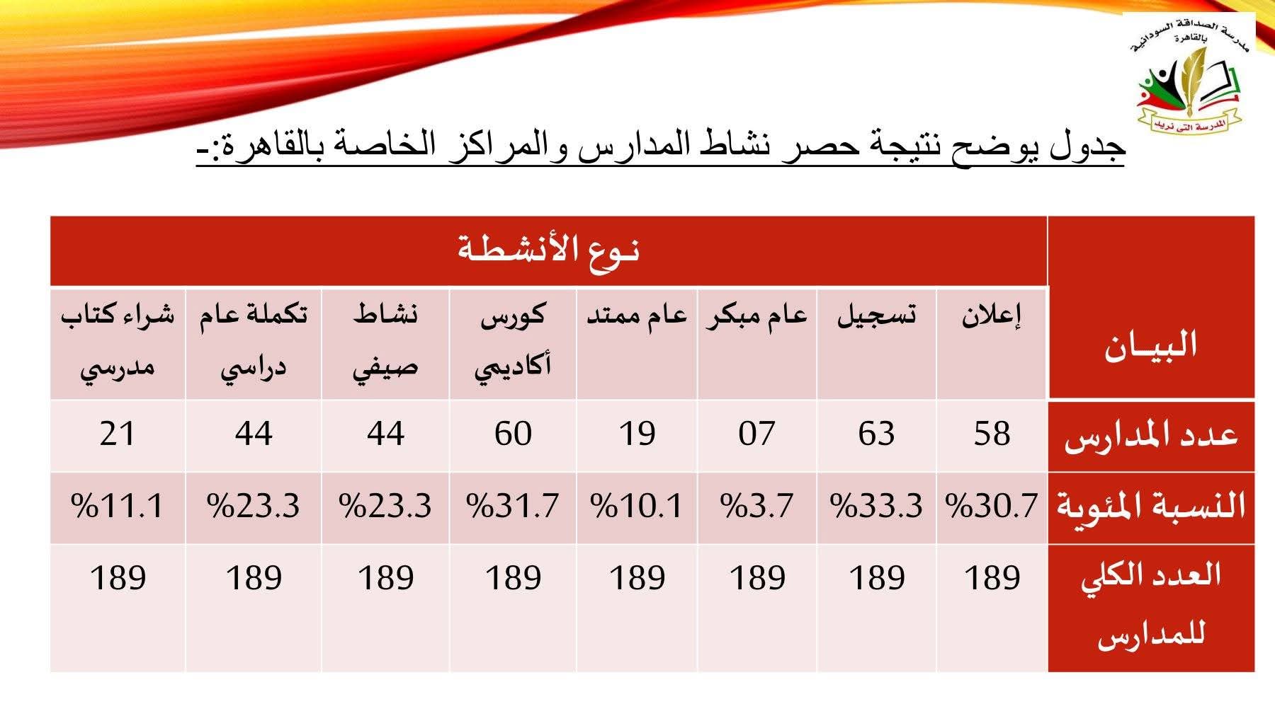 في إطار تنفيذ التعميم الصادر عن مدرسة الصداقة السودانية لتنظيم التعليم العام السوداني في جمهورية مصر العربية، وتحت إشراف المستشارية الثقافية بالسفارة السودانية، قامت لجنة طواف بجولة أولى لرصد نشاط المدارس والمراكز السودانية الخاصة بالقاهرة.