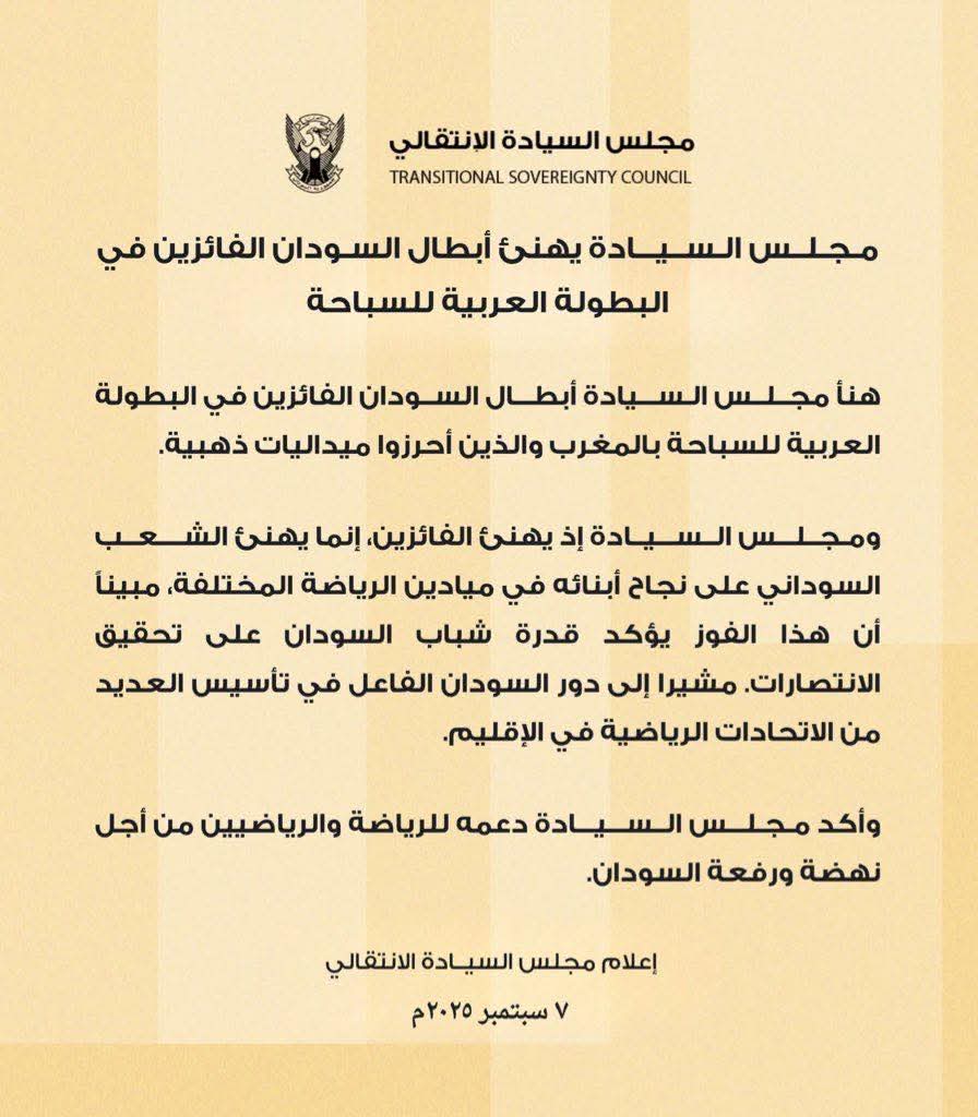 أعرب مجلس السيادة الانتقالي عن تقديره البالغ واعتزازه بالإنجاز الذي حققه أبناء السودان في المغرب، مؤكداً أن ما تحقق يمثل إضافة نوعية لصورة البلاد وإبرازاً لقدرات شبابها وإصرارهم على التميز في المحافل الإقليمية والدولية.