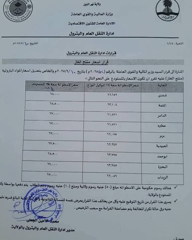 متابعات – النورس نيوز – أعلنت ولاية نهر النيل عن تعديل أسعار أسطوانات الغاز المنزلي، ضمن جهود تنظيم السوق وضمان وصول المنتج للمستهلكين بالسعر الرسمي. وأصدرت وزارة المالية والقوى العاملة، عبر إدارة النقل العام والبترول، القرار استناداً إلى توجيهات الوزير رقم (2025/52م) الصادر في 10 سبتمبر 2025.