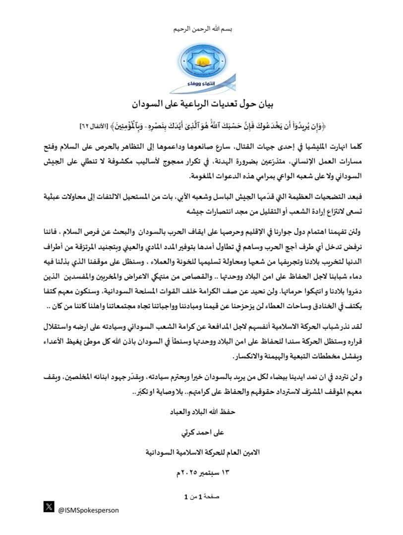 وأشار البيان، الذي جاء بعد التضحيات الكبيرة للجيش وشعب السودان، إلى رفض الحركة لأي تدخل خارجي يمد أطراف النزاع بالموارد ويجند المرتزقة، محذراً من محاولات تخريب البلاد وتسليمها للخونة والعملاء.