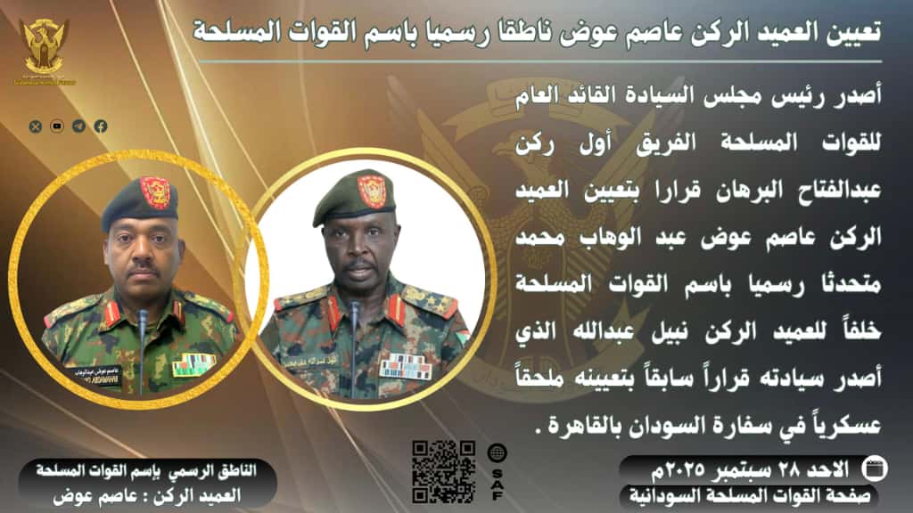 أصدر رئيس مجلس السيادة القائد العام للقوات المسلحة، الفريق أول ركن عبدالفتاح البرهان، قراراً بتعيين العميد الركن عاصم عوض عبد الوهاب محمد متحدثاً رسمياً باسم القوات المسلحة، خلفاً للعميد الركن نبيل عبد الله.