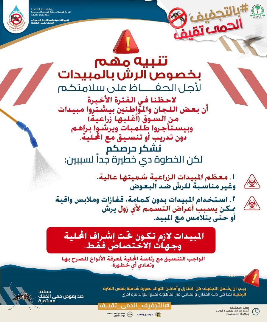 وشددت الجهات المختصة على أن عمليات المكافحة يجب أن تتم تحت إشراف المحليات ووزارة الصحة فقط، وباستخدام المبيدات المصرح بها والمعتمدة من الجهات الفنية. كما دعت المواطنين إلى التنسيق مع إدارات الصحة العامة بالمحليات قبل أي عملية رش.