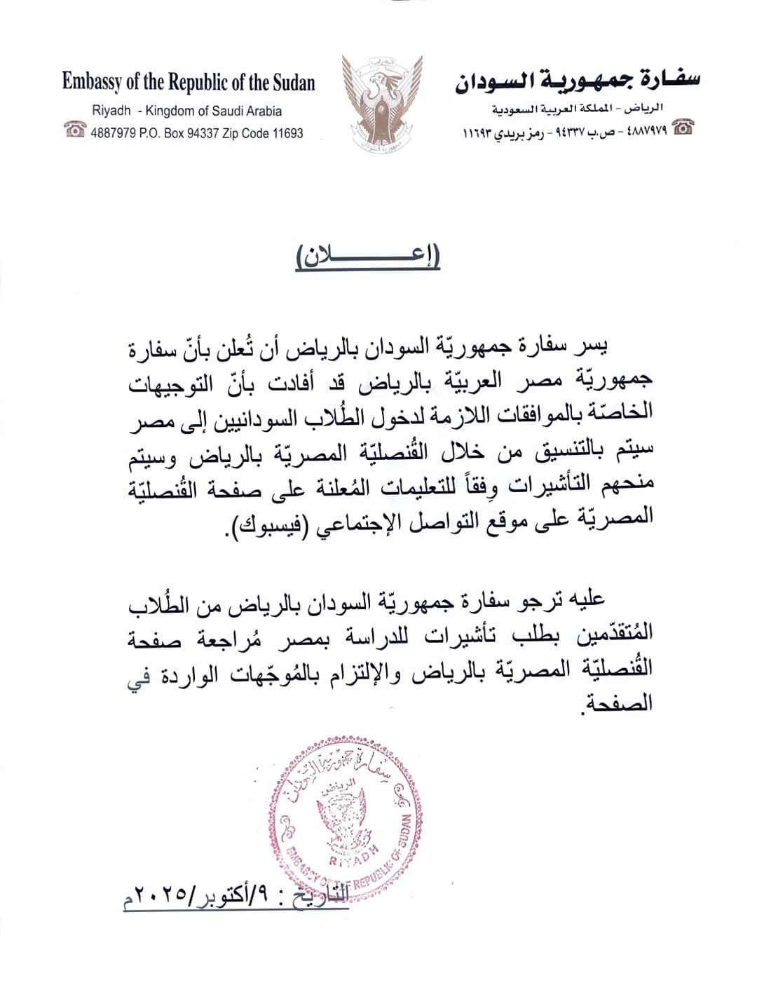 إعلان رسمي من سفارة السودان بالرياض بشأن تأشيرات الطلاب إلى مصر