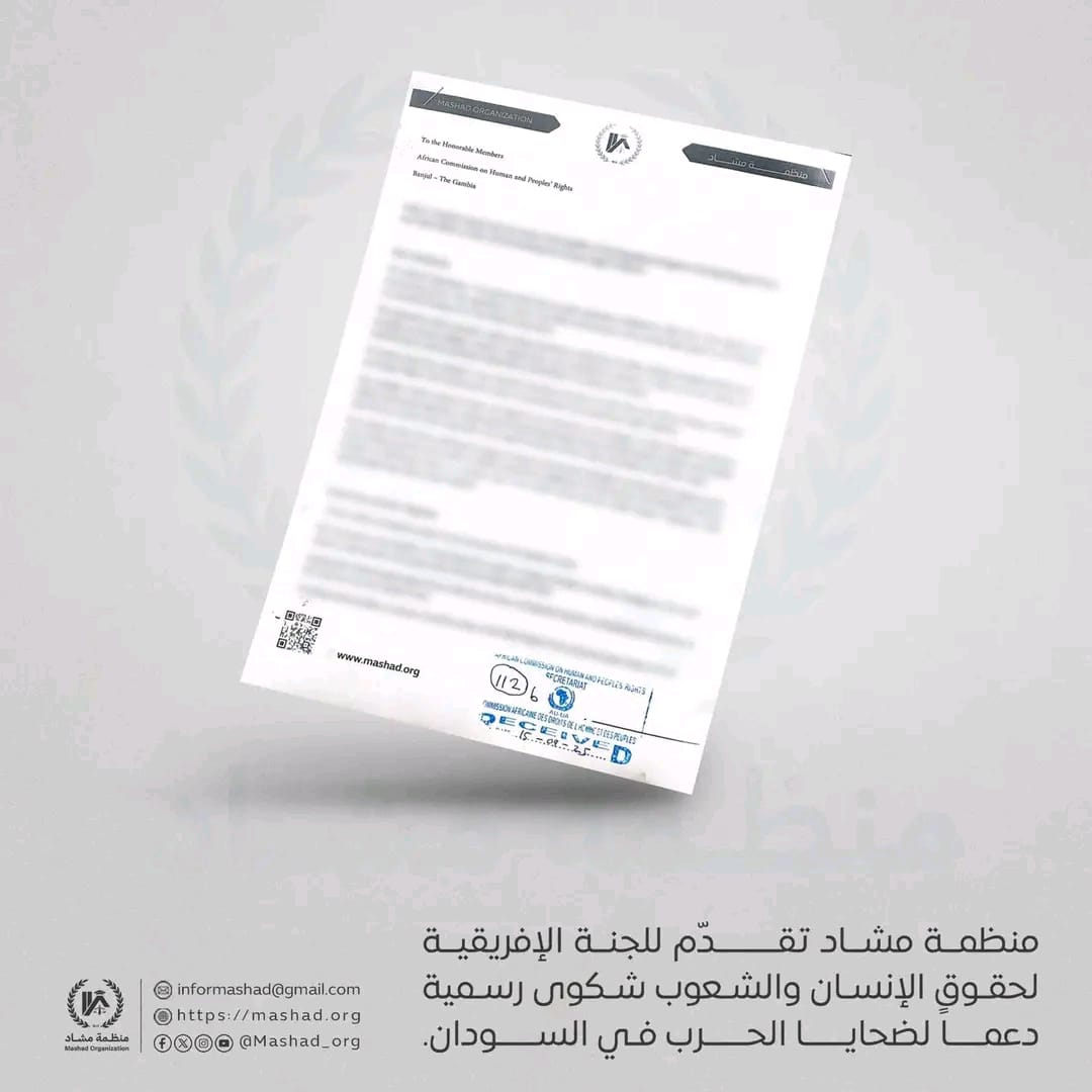 متابعات – النورس نيوز – قدمت منظمة مشاد لحقوق الإنسان والتنمية الإنسانية شكوى رسمية إلى المفوضية الأفريقية لحقوق الإنسان والشعوب في بانجول، غامبيا، نيابة عن ضحايا الحرب في السودان.