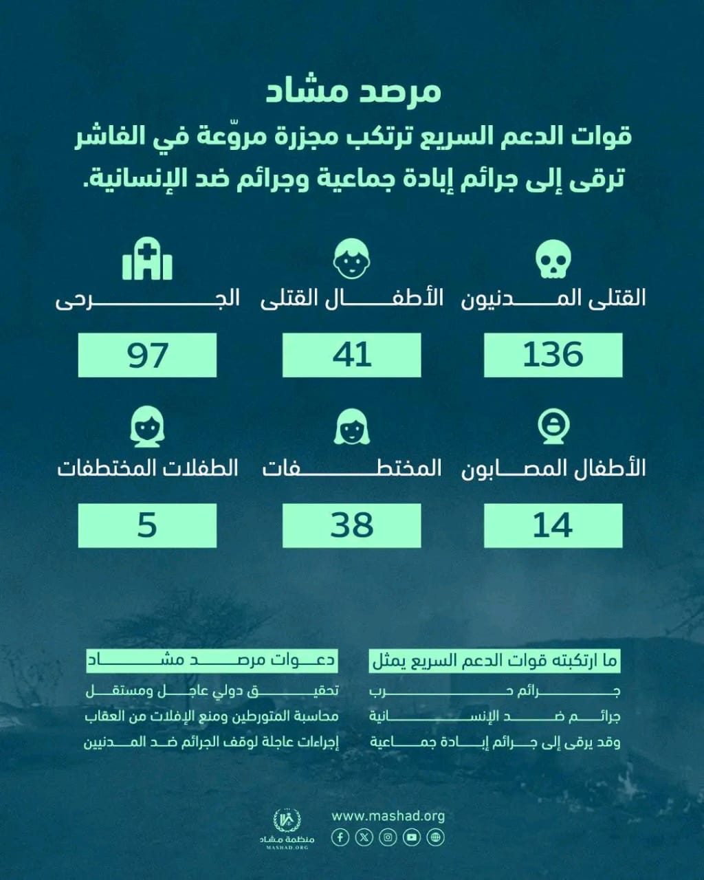 وأكد المرصد أن ما ارتكبته قوات الدعم السريع يشكل جرائم حرب ممنهجة، تهدف إلى إبادة سكان المدينة وترويع المدنيين، محملاً قيادة الدعم السريع المسؤولية الكاملة عن الجرائم، ومطالباً بـ تحقيق دولي عاجل ومستقل لضمان محاسبة المتورطين ومنع الإفلات من العقاب.