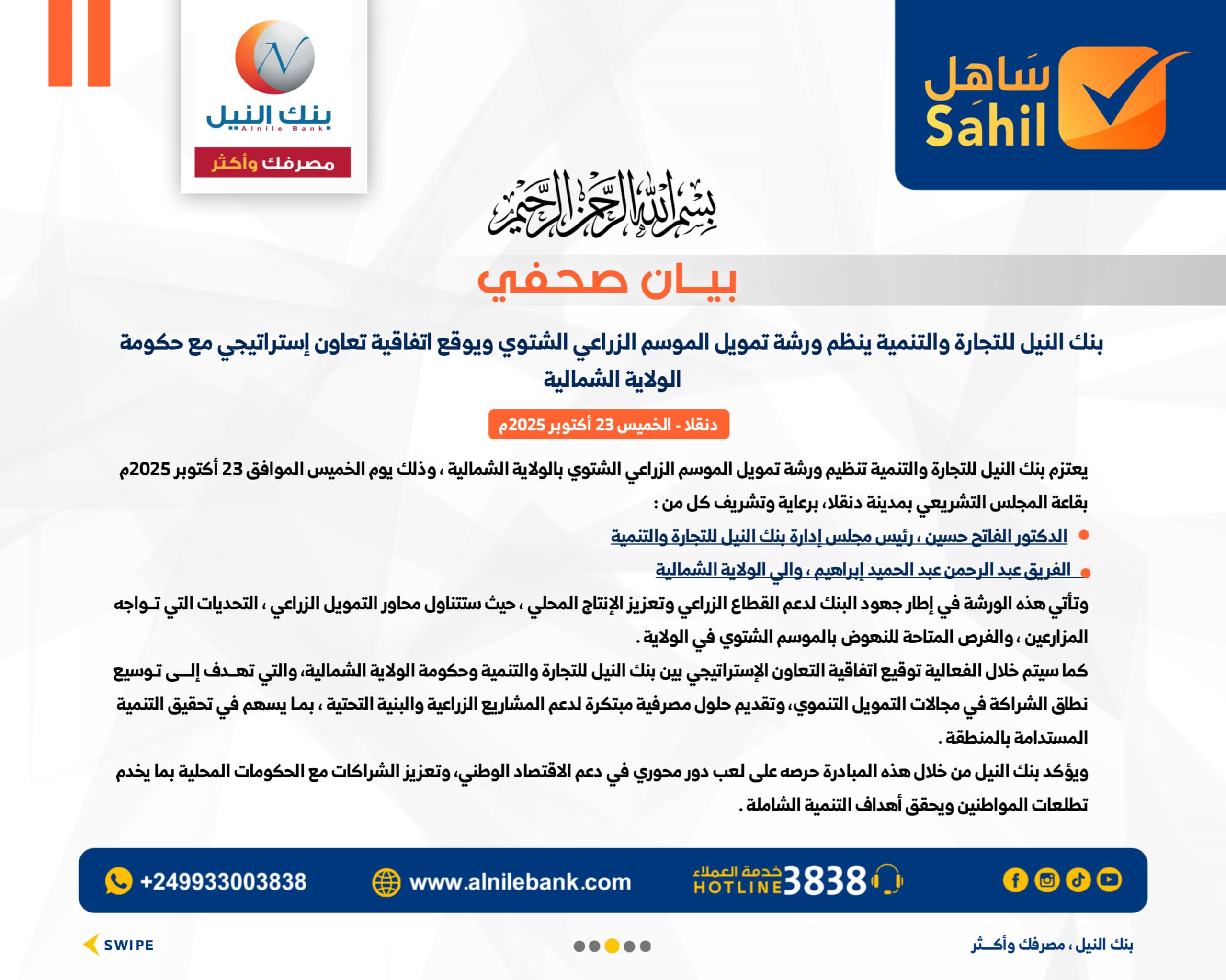 وسيتم خلال الورشة توقيع اتفاقية التعاون الإستراتيجي بين بنك النيل للتجارة والتنمية وحكومة الولاية الشمالية، وتهدف إلى توسيع نطاق الشراكة في مجالات التمويل التنموي، وتقديم حلول مصرفية مبتكرة لدعم المشاريع الزراعية والبنية التحتية، بما يسهم في تحقيق التنمية المستدامة بالمنطقة.