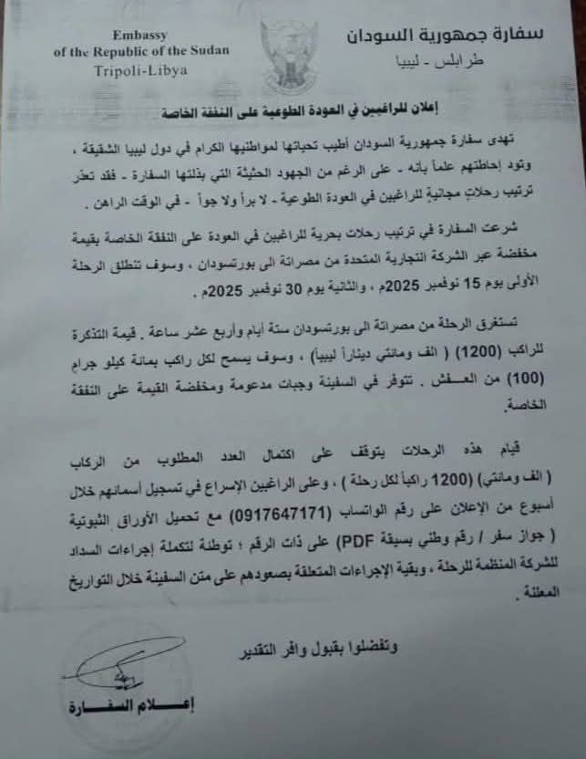 وأكدت السفارة أن تنظيم الرحلات مشروط بإكتمال عدد الركاب داخل الباخرة البالغ 1200 راكب، داعية الراغبين في العودة الطوعية إلى تسجيل أسمائهم، إرسال الأوراق الثبوتية، وسداد قيمة التذاكر تمهيداً لترحيلهم.