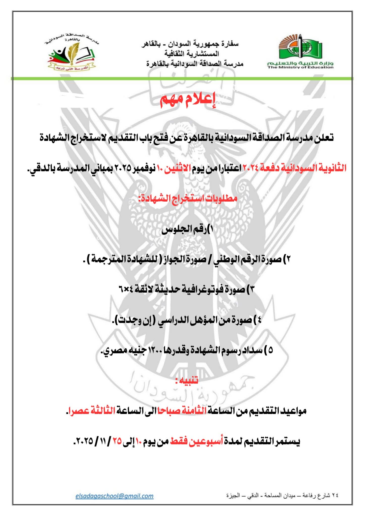 القاهرة – النورس نيوز – أعلنت مدرسة الصداقة السودانية بالقاهرة عن فتح باب التقديم لاستخراج الشهادة الثانوية السودانية لدفعة 2024، اعتباراً من يوم الاثنين 10 نوفمبر 2025، بمباني المدرسة بالدقي.