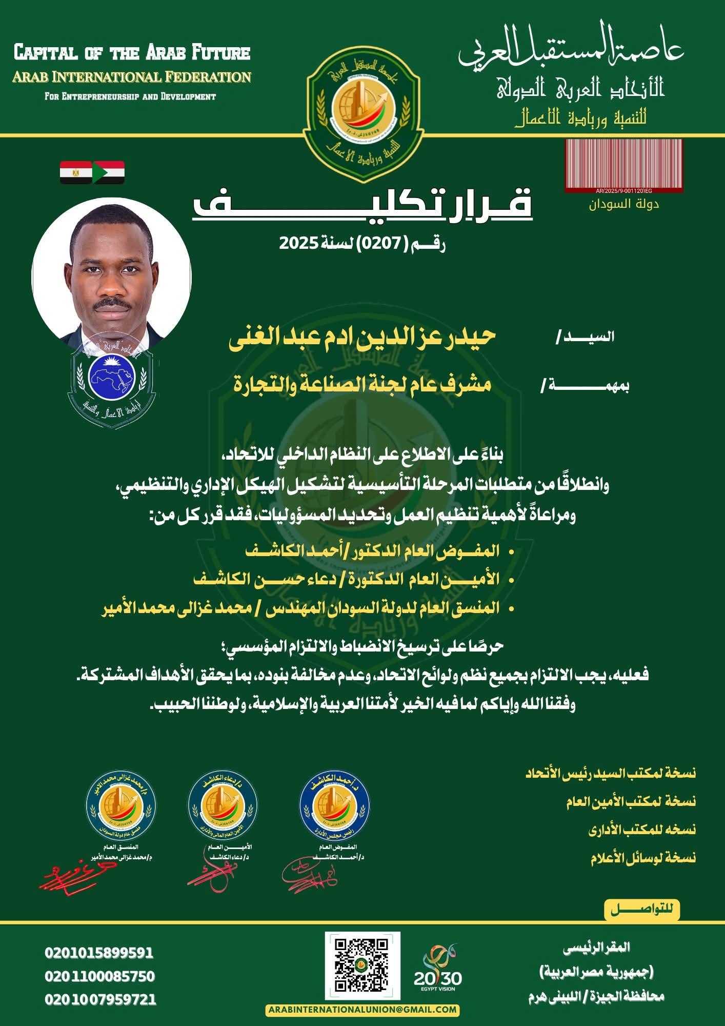 وأصدر القرار كل من الدكتور أحمد الكاشف المفوض العام، والدكتورة دعاء حسن الكاشف الأمين العام، والمهندس محمد غزالي محمد الأمير المنسق العام لدولة السودان، مؤكدين أهمية الالتزام بلوائح الاتحاد والعمل بروح الفريق الواحد لتحقيق الأهداف المشتركة في خدمة الأمة العربية والإسلامية.
