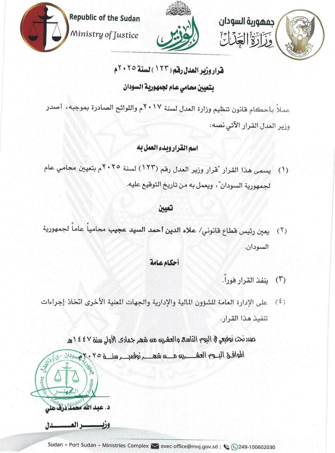 أصدر وزير العدل السوداني، الدكتور عبد الله محمد زكري علي، القرار رقم (123) لسنة 2025 بتعيين علاء الدين أحمد عجيب في منصب محامي عام لجمهورية السودان، ليباشر مهامه الرسمية فور توقيع القرار.