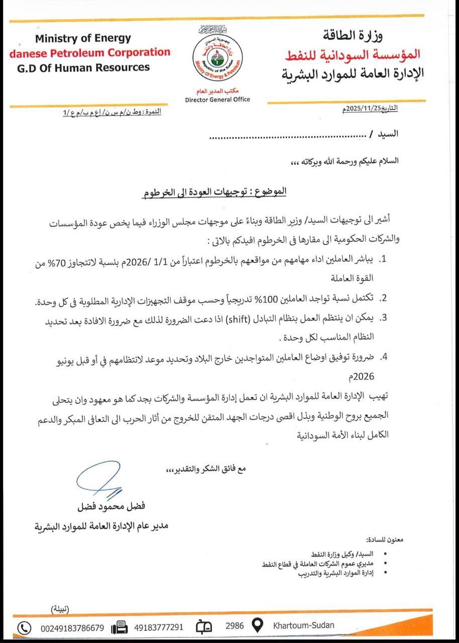 النورس نيوز _ أصدرت وزارة الطاقة والنفط، عبر المؤسسة السودانية للنفط والإدارة العامة للموارد البشرية، تعميماً مهماً وجّهت فيه مؤسسات وشركات القطاع والعاملين بالعودة إلى مقر العمل في الخرطوم اعتباراً من 1 يناير 2026، وذلك تنفيذاً لتوجيهات وزير الطاقة ومقررات مجلس الوزراء بشأن استئناف العمل من العاصمة.