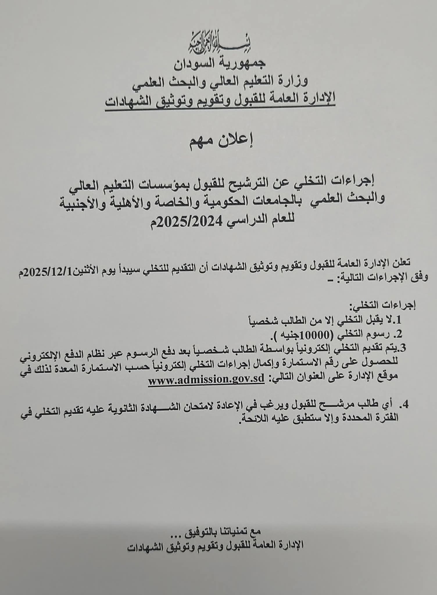 الخرطوم – 30 نوفمبر 2025 -النورس نيوز  – أعلنت الإدارة العامة للقبول وتقويم وتوثيق الشهادات بوزارة التعليم العالي والبحث العلمي بدء إجراءات التخلي عن الترشيح للقبول للعام الدراسي 2024–2025 في مؤسسات التعليم العالي الحكومية والخاصة والأهلية والأجنبية، وذلك اعتباراً من الاثنين 1 ديسمبر 2025. وأوضحت أن الخطوة تأتي في إطار تنظيم عمليات القبول وتطوير الخدمات الإلكترونية لضمان الشفافية وسرعة إنجاز المعاملات.