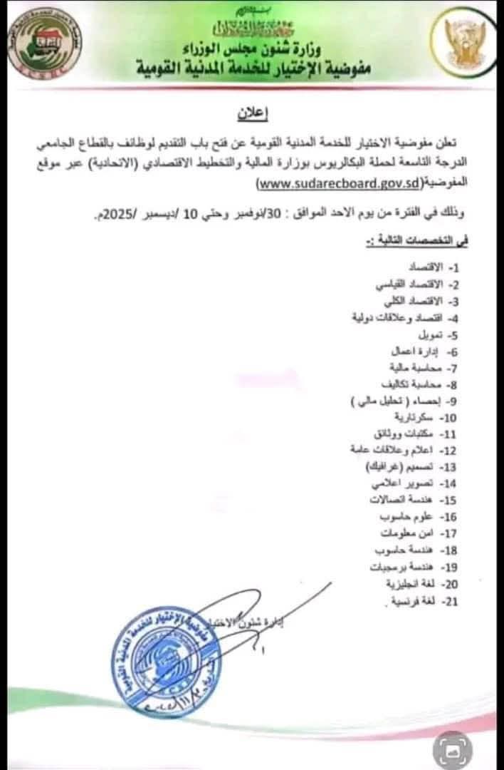 متابعات – النورس نيوز – أعلنت مفوضية الاختيار للخدمة المدنية القومية عن بدء التقديم للوظائف الجامعية بالدرجة التاسعة في وزارة المالية والتخطيط الاقتصادي الاتحادية، لحملة البكالوريوس، وذلك في الفترة من الأحد 30 نوفمبر وحتى 10 ديسمبر 2025، ضمن خطة لتعزيز الكوادر المؤهلة في مختلف التخصصات.